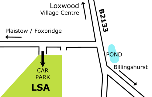 From the centre of Loxwood (adjacent to the shop and Post Office) travel south down the High Street, past the Onslow Arms and canal and continue up Vicarage Hill. At the top take the right turn opposite the pond signposted to Foxbridge Golf Course. The entrance to the LSA car park is 2nd on the left.